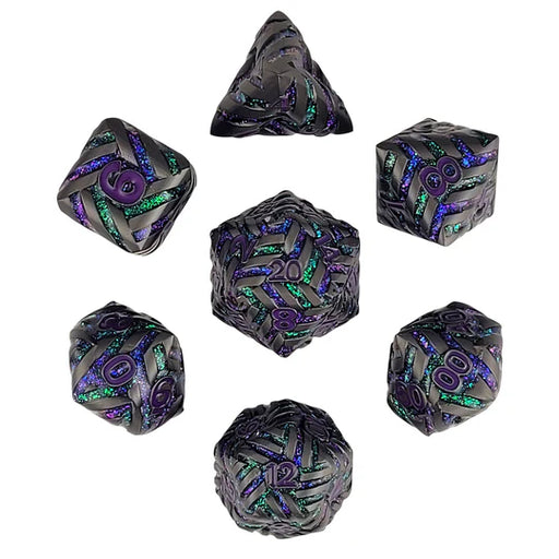 Original price $49.99 - Original price $49.99Original price$49.99$49.99 - $49.99Current price $49.99| /This solid metal RPG dice set features a detailed swirl pattern in a Gunmetal Matte finish with Purple-Green Sparkle Glitter channels.
