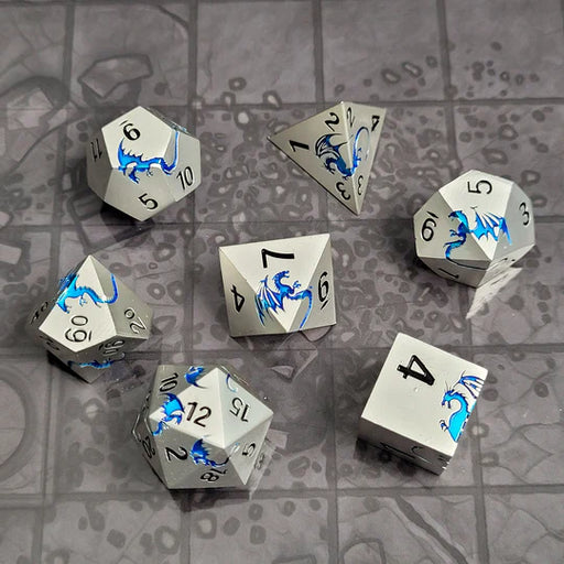 Original price $34.99 - Original price $34.99Original price$34.99$34.99 - $34.99Current price $34.99| /This solid metal RPG dice set features a blue dragon in flight in a Silver Metal finish and black numbers.